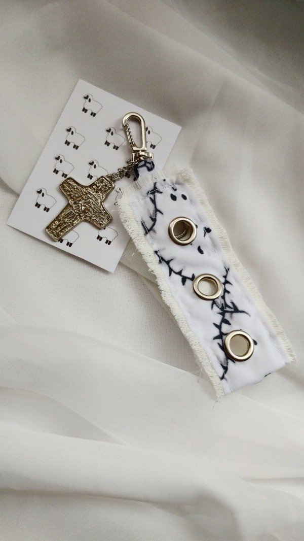 Llavero con la Cruz del buen pastor utilizada por el papá Francisco. Es de tela con estampa de autor y denim blanco y ojales. Mide aproximadamente unos 13 cm de largo