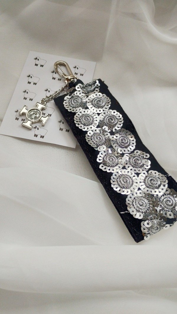 Llavero con medalla Cruz de San Benito. Hecho con un textil hindú bordado de lentejuelas para agarre de unos 14cm de largo aproximadamente.