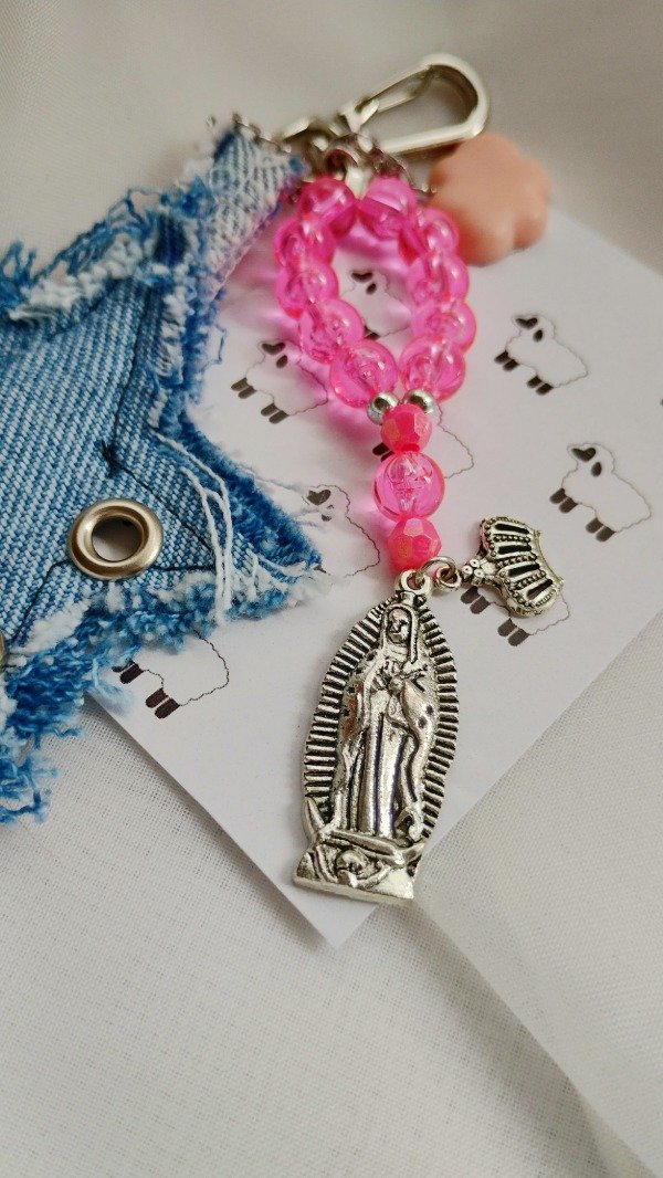 Un denario con medalla de la virgencita de Guadalupe, una estrella (recordándonos su manto) hecha de denim desflecado con remaches y una nubecita rosa 🩷